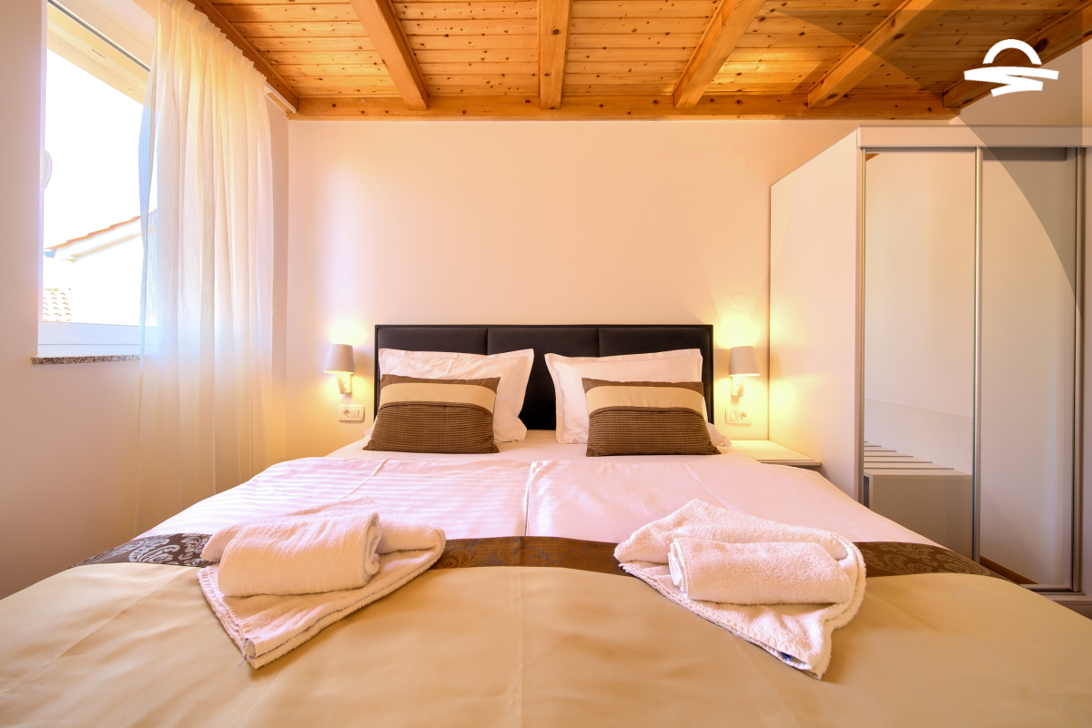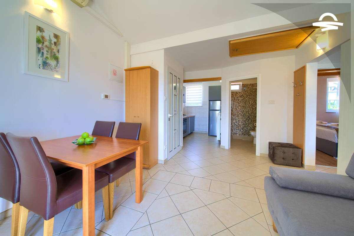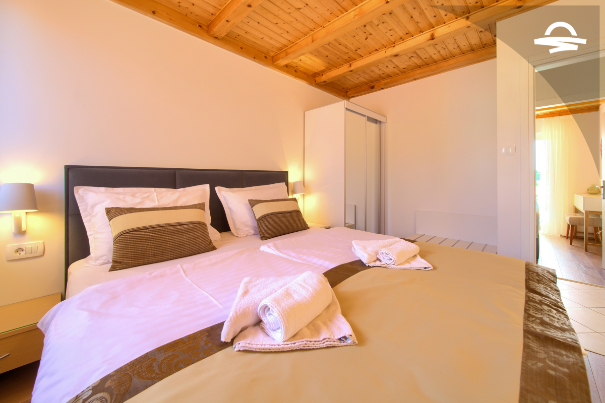 Apartman ima 70 m2, a može ugostiti 4-5 osoba. Sastoji se od dvije spavaće sobe, prostrane kuhinje i dnevnog boravka, kupaonice sa tušem, te balkona sa kojeg se pruža prekrasan pogled na more. Na raspolaganju su vam klima uređaj, WiFi, SAT-TV, zajednički roštilj i jedno parkirno mjesto u dvorištu.