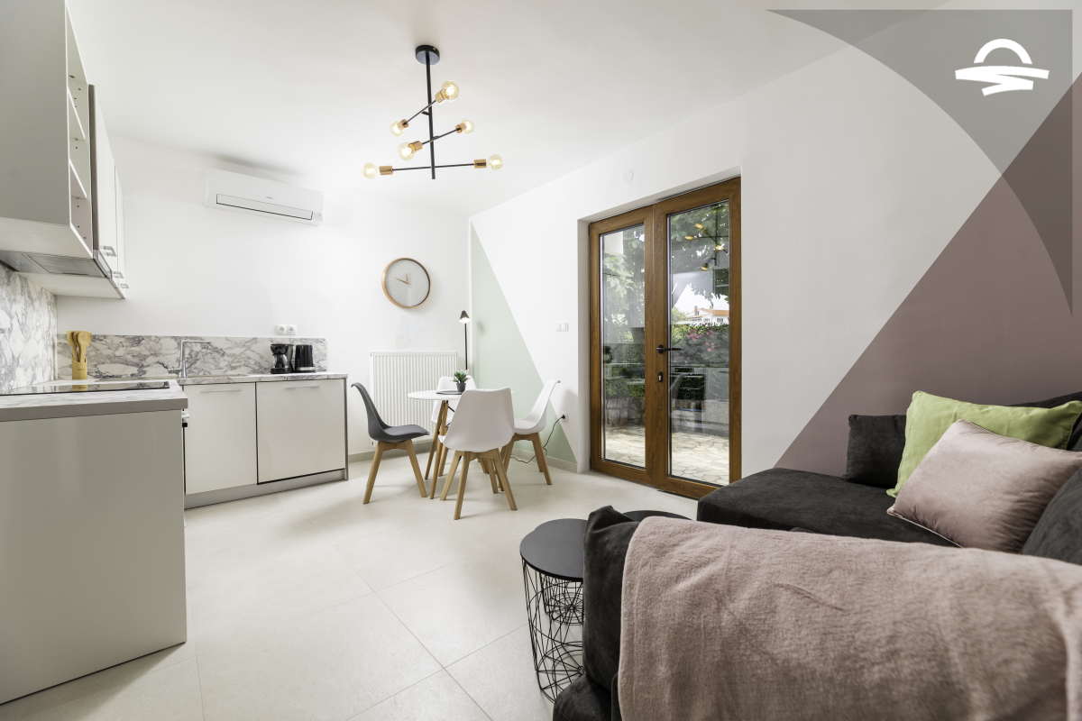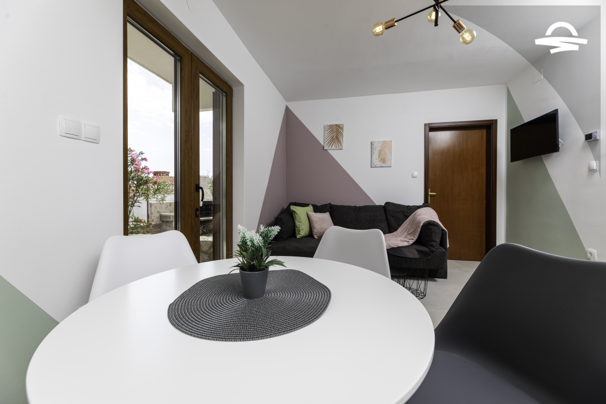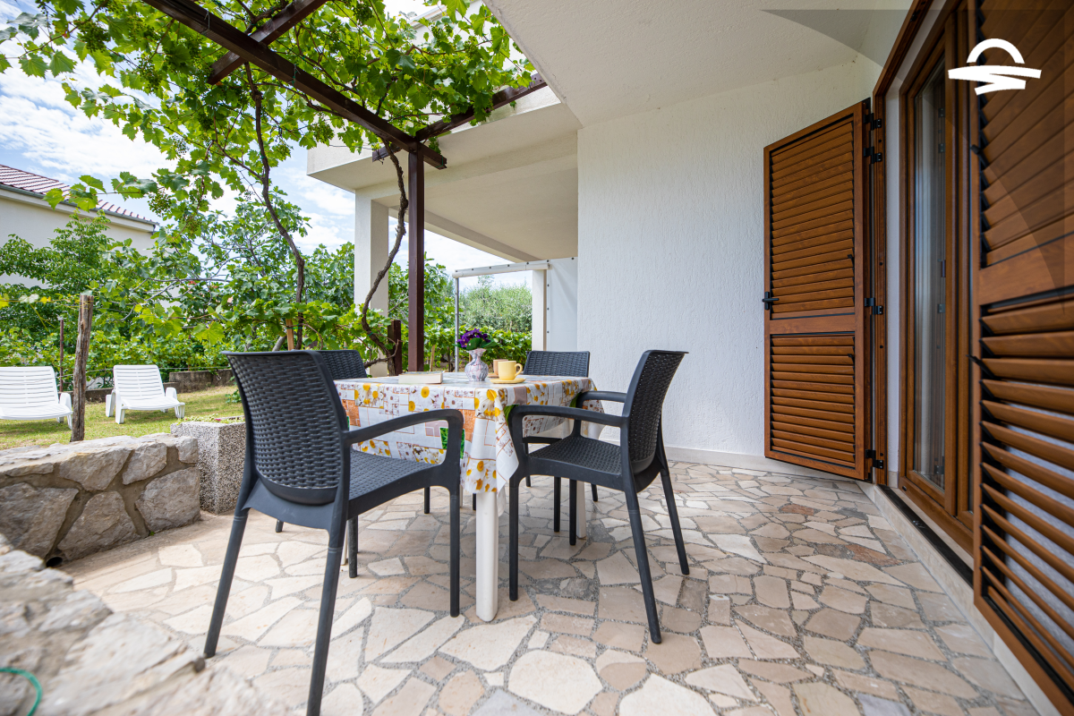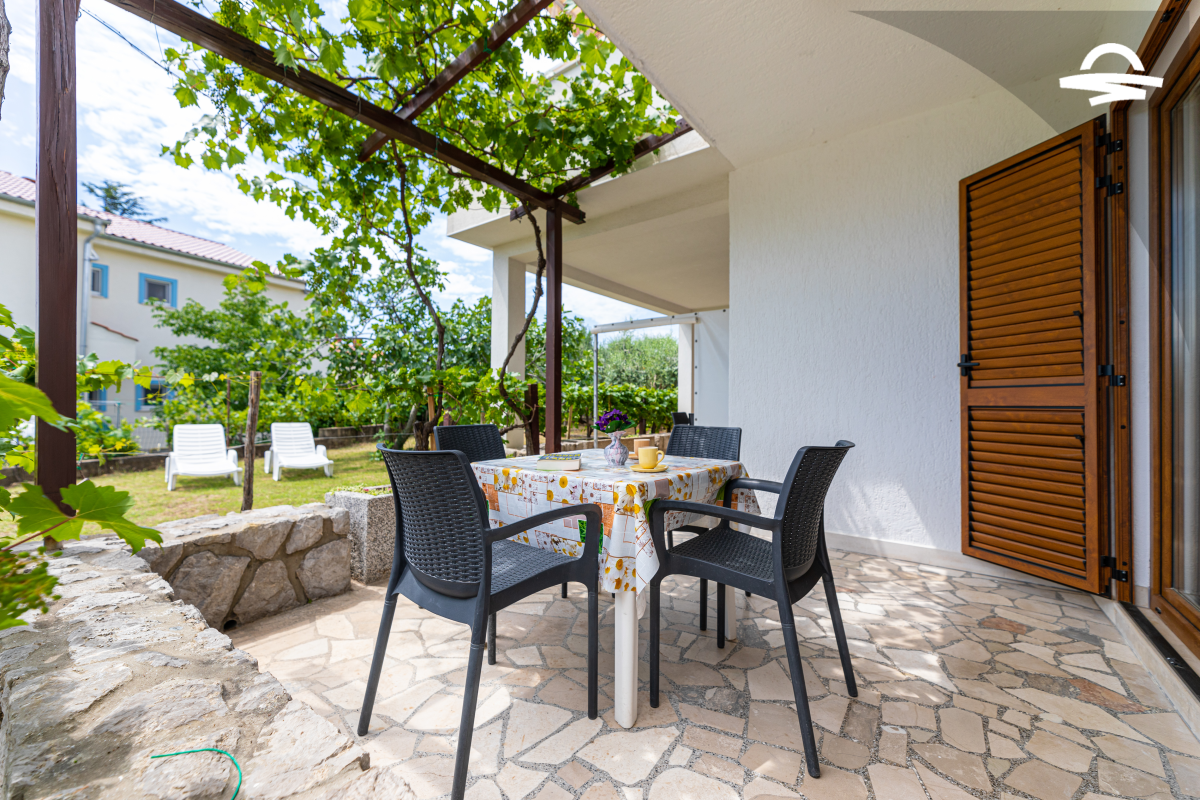 Jednostavno uređen ali udoban apartman Vjeko 1 smješten je u prizemlju obiteljske kuće. Apartman ima 50 m2 i može se smjestiti 4 do 5 osoba. Sastoji se od kuhinje i denevnog boravka, spavaće sobe s bračnim krevetom, spavaće sobe s dva odvojena kreveta, kupaonice s tuš kabinom i terase.