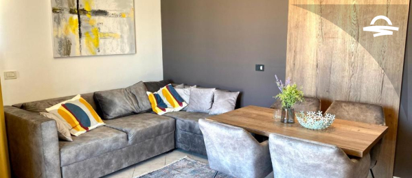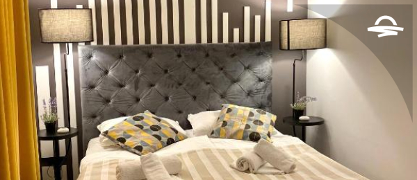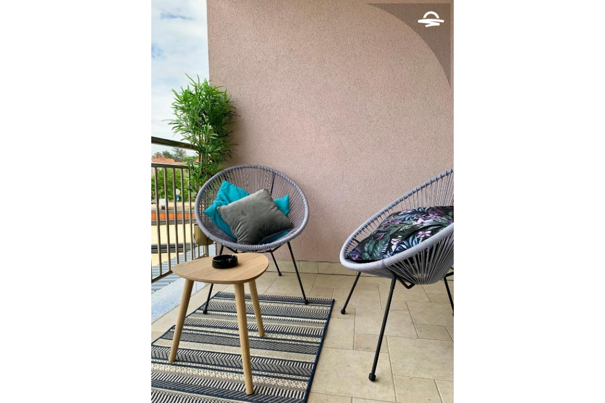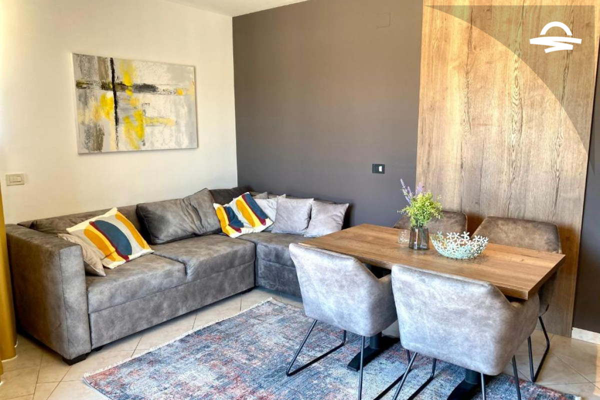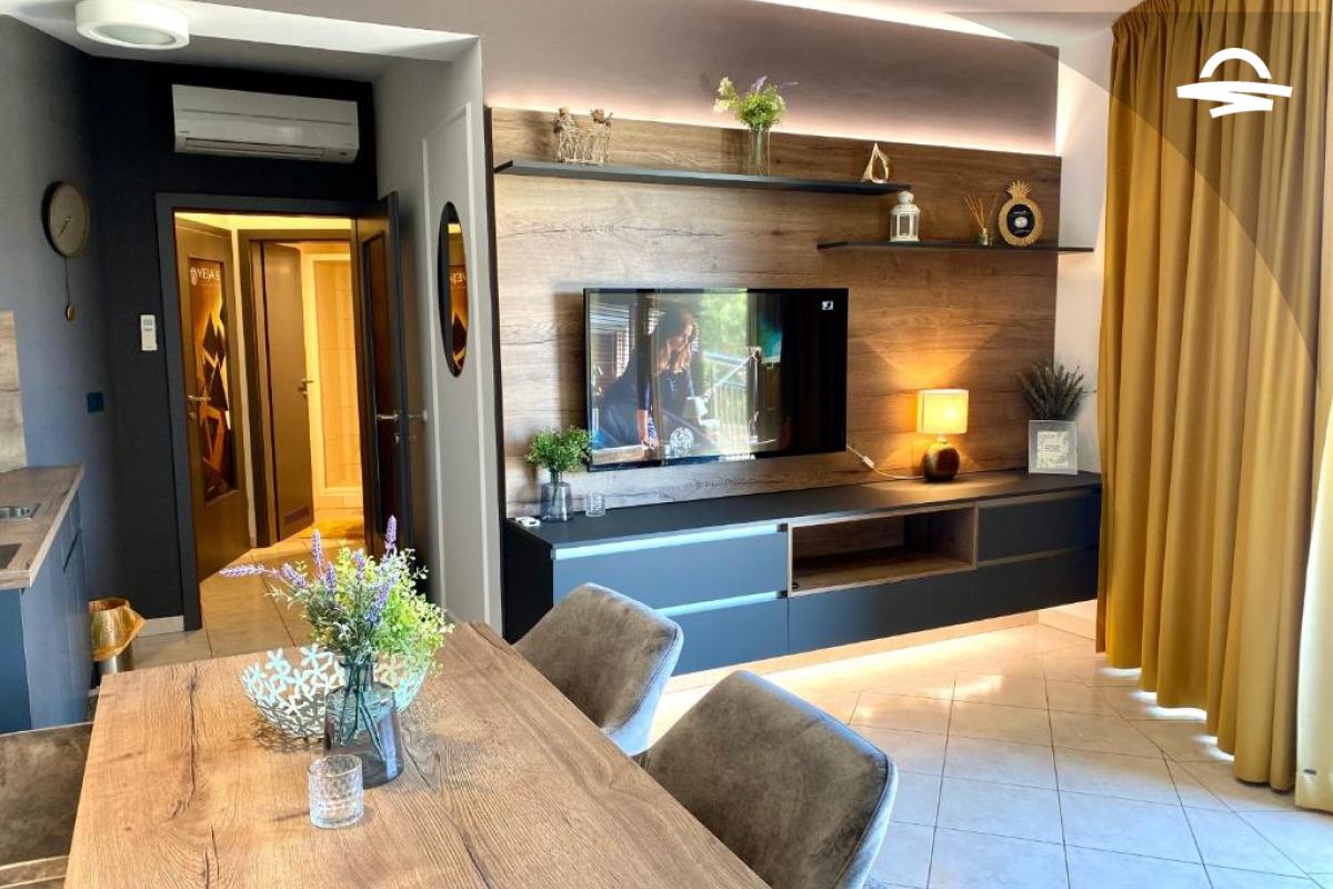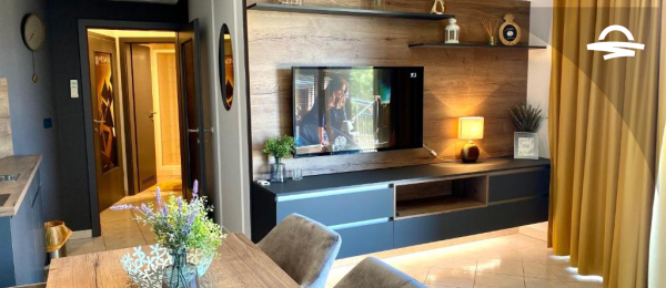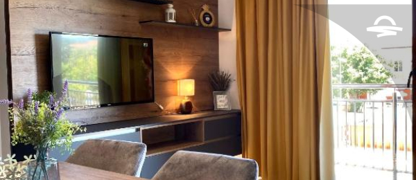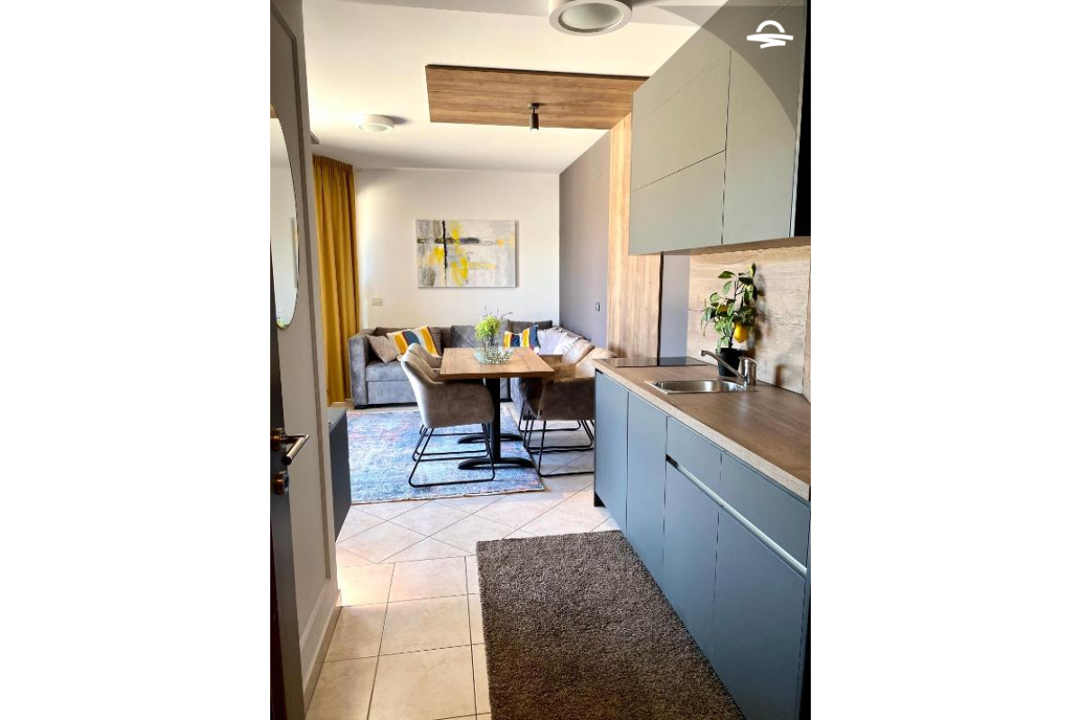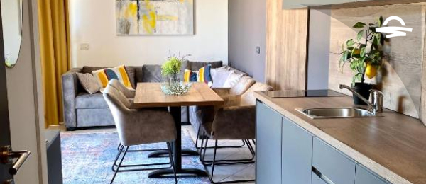 Moderan prostran apartman sa dnevnim boravkom, spavaćom sobom, kuhinjom, kupaonicom i balkonom.