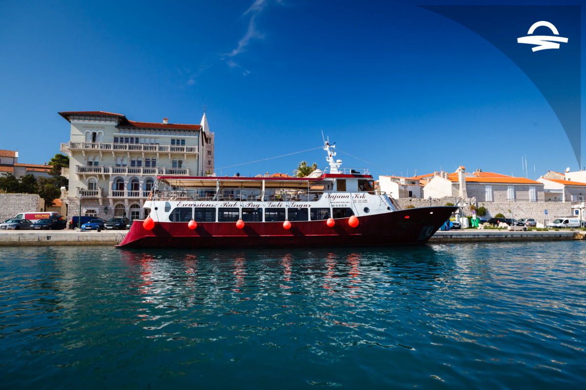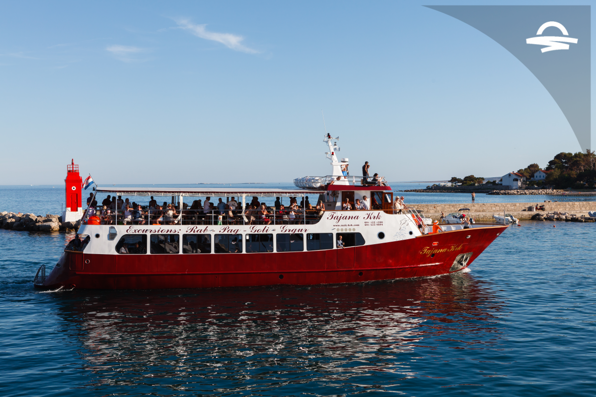 Polazak iz krčke luke je u 09:30h, a prilikom dolaska na brod očekuje vas piće dobrodošlice. Dolazak u grad Rab je oko 11:30. Potom slijedi razgled grada uz vodiča, ali i slobodno vrijeme za razgled ili kupanje. Nakon Raba kreće se za Lun, na otoku Pagu, a tijekom vožnje servira se ručak. Po dolasku u Lun gosti mogu razgledati stare masline i preostalo vrijeme iskoristiti za kupanje. Povratak je planiran u 19:00h.